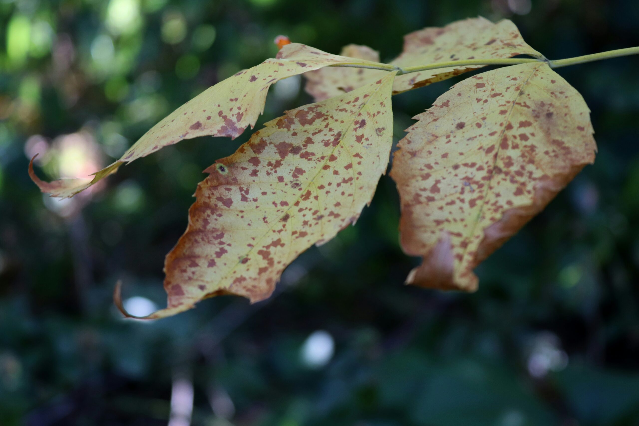 特徵: 這是最棘手的狀況。黑斑通常呈現圓形或不規則狀,周圍常有一圈黃色的暈圈(Yellow Halo)。斑點會隨著時間擴大、融合,導致葉片掉落。